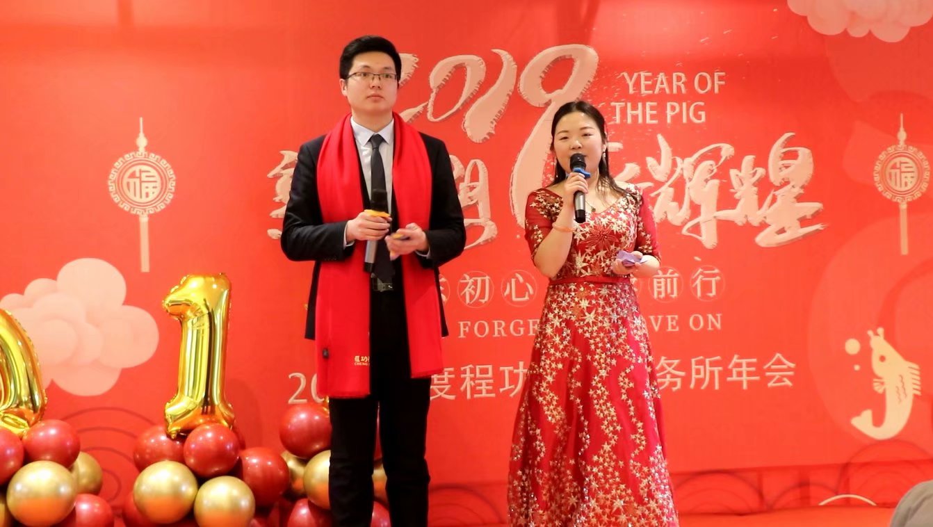 “花径不曾缘客扫,蓬门今始为君开“,古人洒扫门庭,今朝红毯铺地,鲜花在酒店门口迎风招展,仿佛也在恭候贵宾的莅临。十时许,受邀客人陆续而至,隆冬的清冷丝毫不能抵消四海宾朋的热情。“我有嘉宾,鼓瑟吹笙”,程功律所能迈出今天的步伐,离不开广大热心宾客的鼓励和支持。在一派老友重逢的欢声笑语中,嘉宾依次至签名墙留下墨迹,并合影留念。 嘉宾签名留影 酒,已斟满酒杯 心,已满怀喜悦 喜乐绕梁,顷刻间将渔甲一方沉浸在一派欢乐祥和的氛围中 随着时针寂寂旋转 宴会大厅的灯光忽然暗了下来 黑暗中,静静等待 一个声音从角落传来: 年会将于十秒后开启 请各位在场的家人共同倒数 一起迎接我们的2019年: 十,九,八,七,六,五,四,三,二,一...... 瞬间亮灯 目光聚焦处 程功律所股东合伙人杜禹瞳主任已定格于灯火通明中 率先作开场欢迎词 开场终了,掌声雷动 群情欢迎程功律所首席律师吴天阔主任作年度总结致辞 致辞结束,年会正式开启 主持人闪亮登场 律师是个忙得四脚朝天的行当 但忙碌并不能掩盖青春的飞扬 放下卷宗 这也是一个有血有肉有色彩的群体