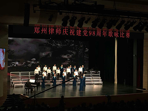 为纪念中国共产党成立98周年,2019年6月28日,由郑州市律师行业党委举办的“不忘初心 牢记使命”--郑州律师纪念建党98周年歌咏比赛活动在郑州师范学院东校区嵩山学堂开幕。此次活动获得全市各律师事务所积极响应、踊跃报名参加,组织本所人员传唱红色经典歌曲共计23曲目,展现了郑州律师的爱党爱国情怀,彰显了郑州律师“听党话、跟党走”的坚定信心。 郑州律师纪念建党98周年歌咏比赛曲目 ★ 《我和我的祖国》 《在灿烂阳光下》 《走向复兴》 《红星歌、我们走在大路上》 建党98周年歌咏比赛 ★ 《映山红》 《歌唱祖国》 《祖国不会忘记》 《中国中国鲜红的太阳永不落》 建党98周年歌咏比赛 ★ 《南泥湾》 《五星红旗》 《诗意中国》 《游击队之歌》 建党98周年歌咏比赛 ★ 《我爱北京天安门》 《我和我的祖国》 《共筑中国梦》 《在希望的田野上》 《毛委员和我们在一起》 建党98周年歌咏比赛 ★ 《八月桂花遍地开》 《再一次出发》 《江山》 《光荣与梦想》 《我们走在大路上》 建党98周年歌咏比赛 |